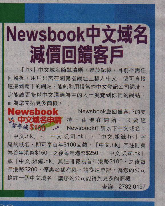 ". hk" Chinese domain name is simple and clear, easy-to-remember. At present, without any conversion, the user only inputting Chinese characters in the web site browser will be able to connect to your website directly. Take advantage of the usual Chinese Web site registration, could let the mainly using Chinese people to visit your website, and give you more opportunities to get business! Newsbook thanks for customer support, from now on, as long as the application in Newsbook by the following of these Chinese domain name: Chinese. hk / Chinese. Company. hk / Chinese. organizations. hk domain name, the first year give $ 100 back. Chinese. hk, registration fees as follows: the first year of HKD150, year after HKD250. Chinese. co. hk / Chinese. organizations. hk, first year of its registration fee is HKD100, year after is HKD200. Concessionary numbers are limited; please call as soon as possible Newsbook: 2782-0197 to register a Chinese domain name for your company, so your company can get more business opportunities.