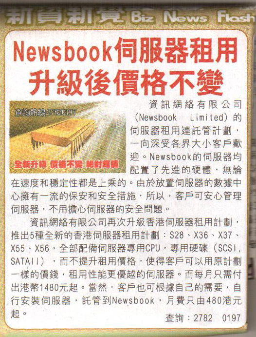 Newsbook another to meet the needs of different customers, also provides economic, standards-based server rental plan. And the economic plan, the monthly fee only by HK$880, the rental will be hosted on the server in nine different data centers in Hong Kong. Customers may according their needs to install the server, and then hosting in Newsbook, a monthly fee of only start from HK$480.