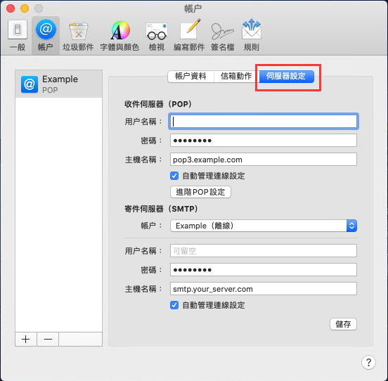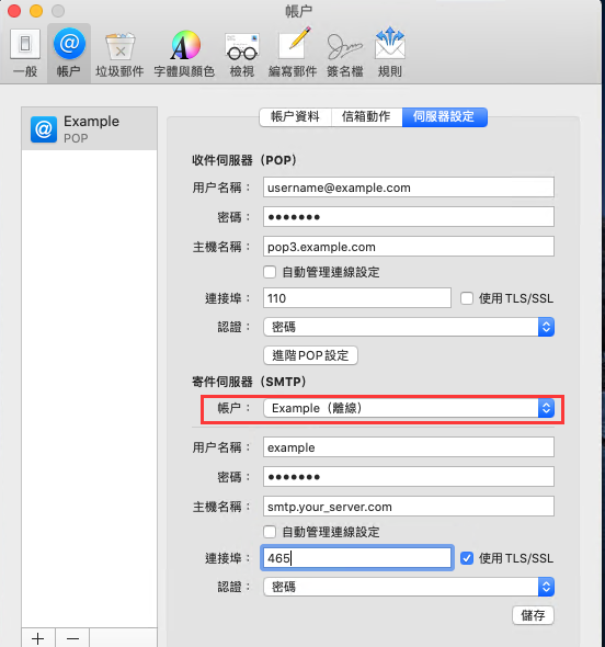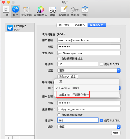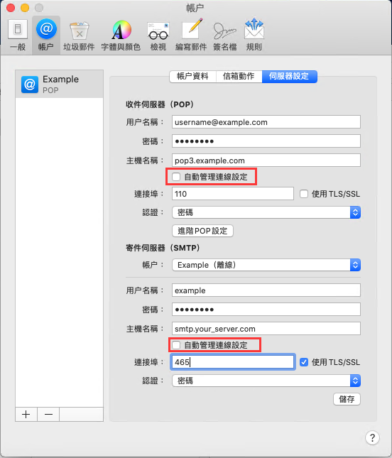 填寫寄件伺服器中的"用戶名稱"為密碼紙的smtp帳戶,重新輸入smtp密碼,取消勾選"自動管理連線設定",連接埠為465,認證方式為密碼