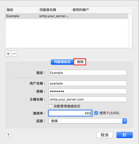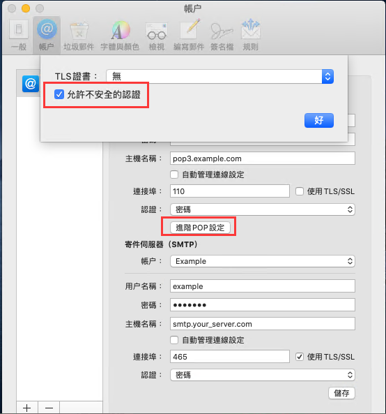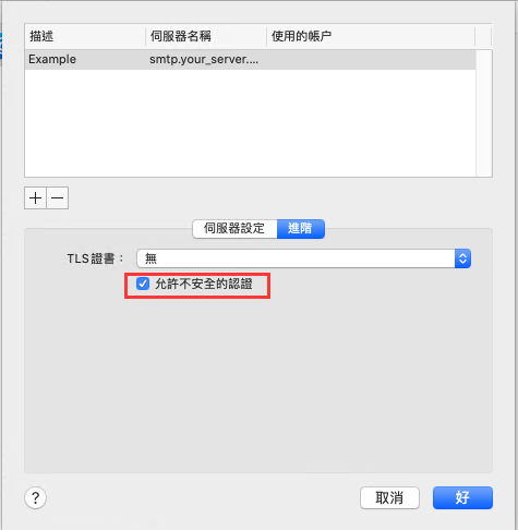 如果收件伺服器無法通過驗證,可以考慮設定允許不安全認證