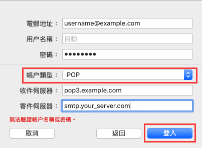 06 輸入收件伺服器和寄件伺服器,並按"登入",如果顯示登入"失敗",則繼續按"登入",使得設定得以儲存