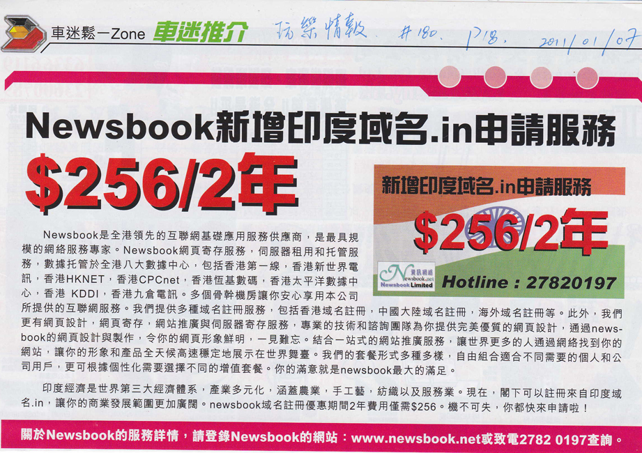 印度經濟是世界第三大經濟體系,產業多元化,涵蓋農業,手工藝,紡織以至服務業。現在,閣下可以註冊來自印度域名.in,讓你的商業發展範圍更加廣闊。newsbook域名註冊優惠期間2年費用僅需$256。機不可失,你都快來申請啦!