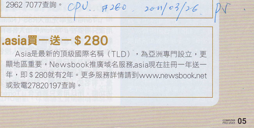 Asia是最新的頂級國際名稱(TLD), 為亞洲專門設立, 更顯地區重要, Newsbook推廣域名服務.asia現在註冊一年送一年, 即$280就有2年。更多服務詳情請到www.newsbook.net 或致電2782 0197查詢。