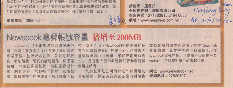 電郵服務是公司內部或外部溝通的重要橋樑。你是否為無法正常收發電郵或為繁瑣的設置而煩惱。選擇Newsbook資訊網絡, 專業解決你一切煩惱! 現在newsbook 電郵容量更可倍增至每個帳戶為200MB, 更能應對繁忙的電郵往來。