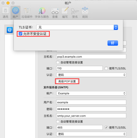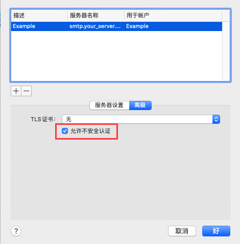 如果收件服务器无法通过验证,可以考虑设置允许不安全认证
