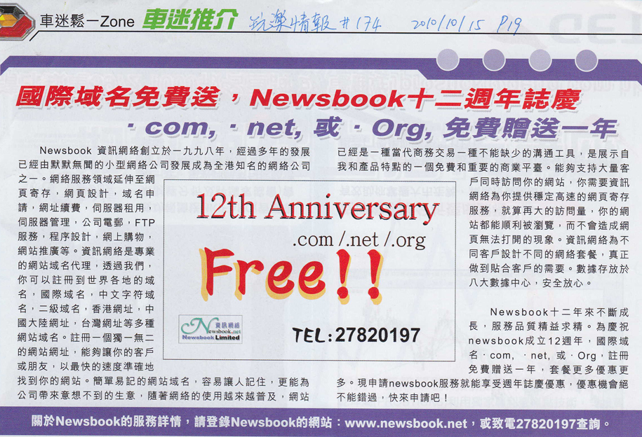 Newsbook十二年来不断成长, 服务品质精益求精?为庆祝newsbook成立12周年, 国际域名.com, .net, 或 .Org, 注册免费赠送一年, 套餐更多优惠更多?现申请newsbook服务就能享受周年志庆优惠, 优惠机会绝不可错过, 快来申请吧!