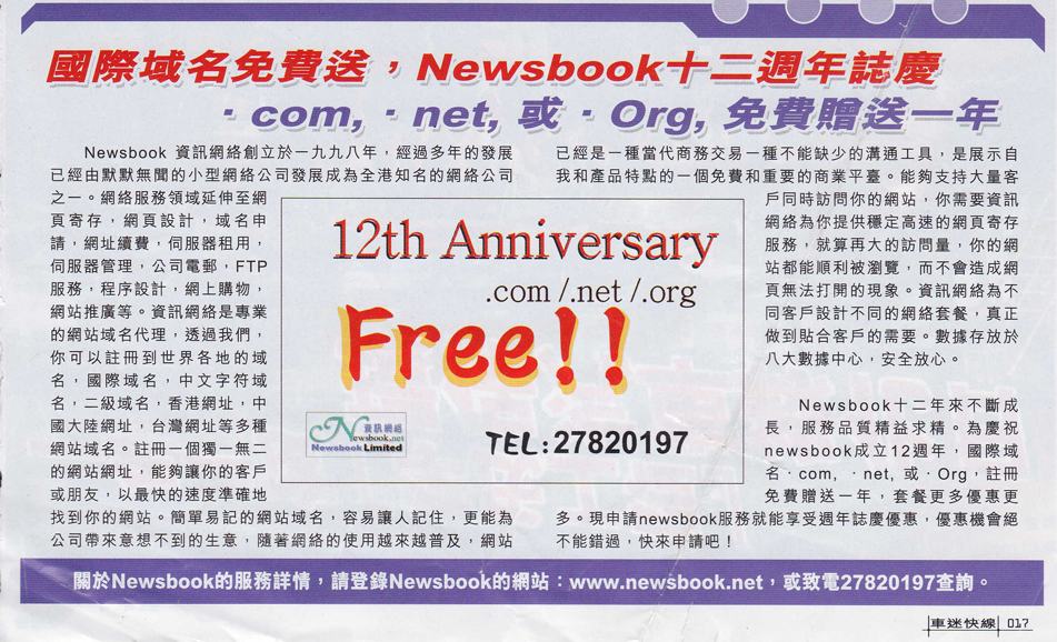 Newsbook十二年来不断成长, 服务品质精益求精?为庆祝newsbook成立12周年, 国际域名.com, .net, 或 .Org, 注册免费赠送一年, 套餐更多优惠更多?现申请newsbook服务就能享受周年志庆优惠, 优惠机会绝不可错过, 快来申请吧!
