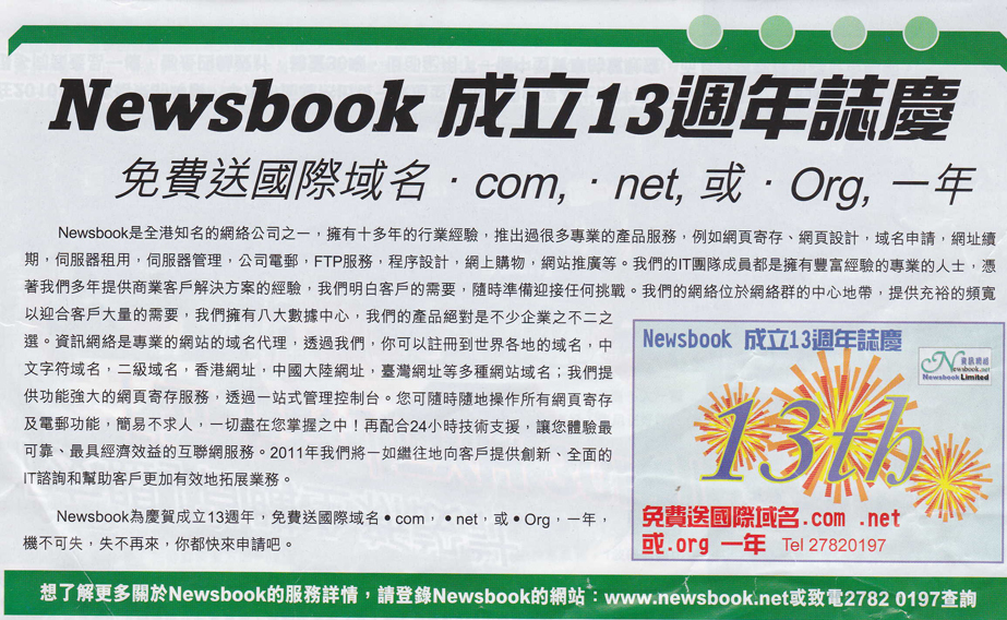 Newsbook是全港知名的网络公司之一,拥有十多年的行业经验,推出过很多专业的产品服务,例如网页寄存、网页设计,域名申请,网址续期,服务器租用,服务器管理,公司电邮,FTP服务,程序设计,网上购物,网站推广等。我们的IT团队成员都是拥有丰富经验的专业人士,凭着我们多年提供商业客户解决方案的经验,我们明白客户的需要,随时准备迎接任何挑战。我们的网络位于网络群的中心地带,提供充裕的频宽以迎合客户大量的需要,我们拥有八大数据中心,我们的产品絶对是不少企业之不二之选。资讯网络是专业的网站的域名代理,透过我们,你可以注册到世界各地的域名,中文字符域名,二级域名,香港网址,中国大陆网址,台湾网址等多种网站域名;我们提供功能强大的网页寄存服务,透过一站式管理控制台,您可随时随地操作所有网页寄存及电邮功能,简易不求人,一切尽在您掌握之中!再配合 24 小时技术支援,让您体验最可靠、最具经济效益的互联网服务。2011年我们将一如继往地向客户提供创新、全面的IT谘询和帮助客户更加有效地拓展业务。