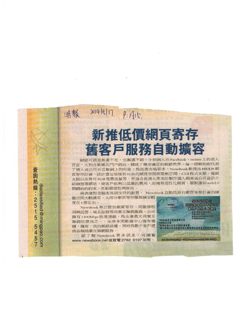 Newsbook是全港知名的网络公司之一,為庆贺成立15週年,答谢顾客多年的支持,服务全面提升,Plan48网页空间由原来的500MB增大到1GB,流量由原来5GB增大到10GB,Plan68网页空间由原来的1000MB增大到2GB,流量从8GB增大到15GB, Windows平台88NT网页空间由1000MB增大到3GB,流量也同时增大至20GB,相同的价格,让你可以享受更多的服务。再配合24 小时技术支援,让您体验最可靠、最具经济效益的互联网服务。 2013年我们将一如继往地向客户提供创新、全面的IT諮询和帮助客户更加有效地拓展业务。不要犹豫,立即申请开通服务吧。 想了解更多关於Newsbook的优惠,请登录Newsbook的网站: www.newsbook.net或致电2782 0197查询。