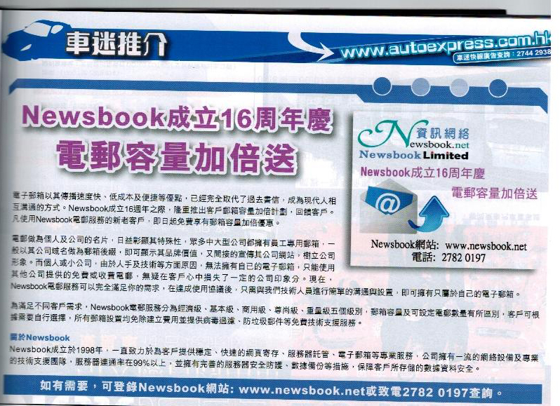 Newsbook自1998年成立以来,一直致力於為客户提供稳定、快速的网页寄存、服务器託管等专业服务,公司拥有一流的网络设备及专业的技术支援团队,客户网站连通率在99%以上,并拥有完善的服务器安全防护、数据备份等措施,保障客户所存储的数据资料安全。做為全港五大商业互联网供应商之一,Newsbook除网页储存外,还提供有网页设计、服务器管理、自助网上商店系统、域名註册、网站推广等互联网服务,更多信息可登录Newsbook网站: www.newsbook.net或致电2782 0197查询。