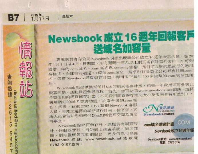 电子邮箱以其传播速度快、低成本及便捷等优点,已经完全取代了过去书信,成為现代人相互沟通的方式。Newsbook成立16週年之际,隆重推出客户邮箱容量加倍计画,回馈客户。凡使用Newsbook电邮服务的新老客户,即日起免费享有邮箱容量加倍优惠。