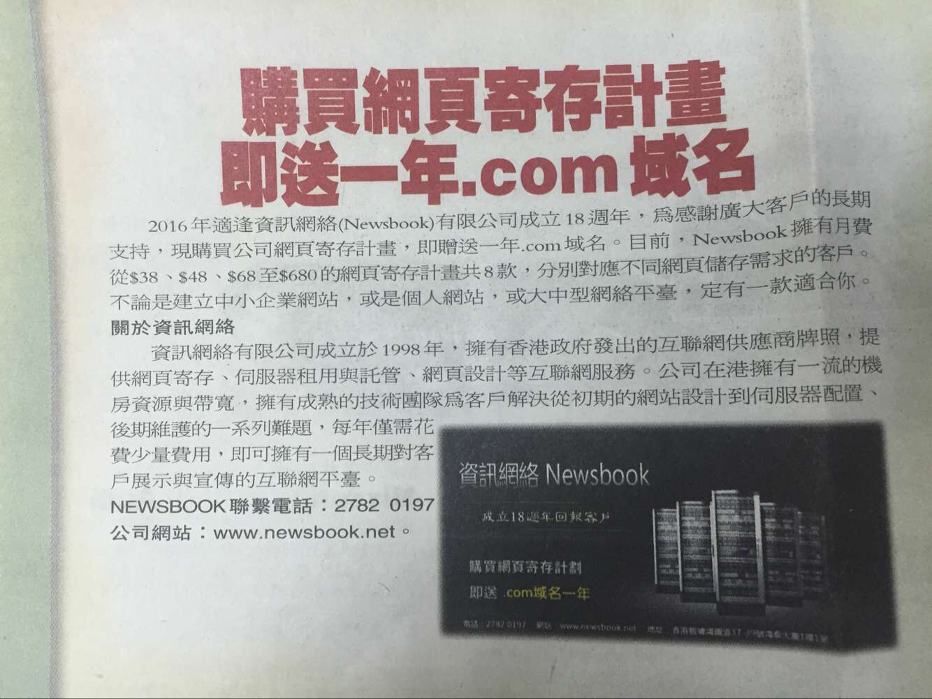 2016年适逢信息网络(Newsbook)有限公司成立18周年,为感谢广大客户的长期支持,现购买公司网页寄存计划,即赠送一年.com域名。目前,Newsbook拥有月费从$38、$48、$68至$680的网页寄存计划共8款,分别对应不同网页储存需求的客户。不论是建立中小企业网站,抑或是个人网站,或大中型网络平台,定有一款适合你。