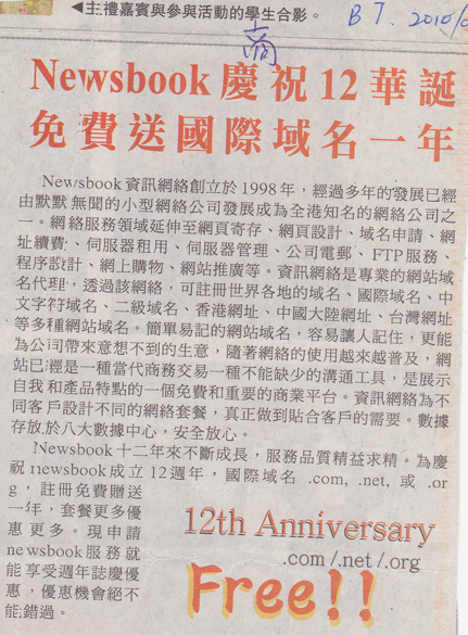 Newsbook十二年来不断成长, 服务品质精益求精?为庆祝newsbook成立12周年, 国际域名.com, .net, 或.org, 注册免费赠送一年, 套餐更多优惠更多?现申请newsbook服务就能享受周年志庆优惠, 优惠机会绝不可错过?
