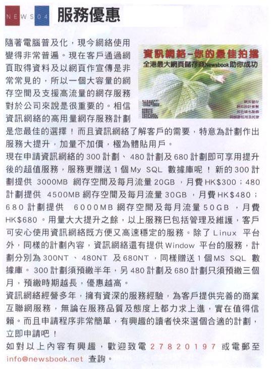资讯网络是香港最大的网页储存,网页寄存,服务器托管,服务器租用,网页设计公司 资讯网络(Newsbook)是香港最具规模的网页储存商,提供稳定可靠的网页寄存及电邮服务,适合香港,中国及其他地区客户。