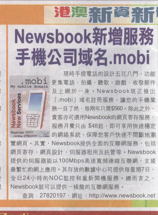 如今手机的样式推陈出新,颜色五彩缤纷,硬体和软体设计五花八门,手机功能集接听电话、影像、听广播、播放MP3,打游戏、收发邮件、上网于一体,而手机网站也在不断改进,为广大手机用户提供最优质的服务,越来越多的公司正从事相关此类服务,但如何让您的客户更好更快速地查询到您公司? Newsbook现正推出.mobi域名注册服务,让您的手机业务一目了然,价钱两年只需HKD560, 快来Newsbook申请.mobi手机域名啦!