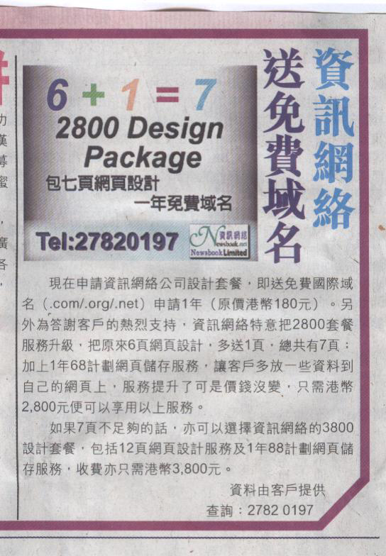 现在申请资讯网络公司设计套餐,即送您免费国际域名 .com/.org/.net 申请一年 (原价HK$180)。另外为答谢客户的热烈支持,资讯网络特意把2800套餐服务升级,把原来 6页网页设计,多送1页,总共有 7 页,加上一年68计划网页储存服务,让客户多放一些资料到自己的网页上,服务提升了可是价钱没变,只须 HK$2800你就可以享用以上服务。如果7页不足够的话,您亦可以选择资讯网络的3800设计套餐,包括12页网页设计服务及一年88计划网页储存服务,收费亦只是 HK$3800 !