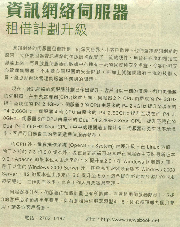 资讯网络是香港最大的网页储存,网页寄存,服务器托管,服务器租用,网页设计公司 资讯网络(Newsbook)是香港最具规模的网页储存商,提供稳定可靠的网页寄存及电邮服务,适合香港,中国及其他地区客户。