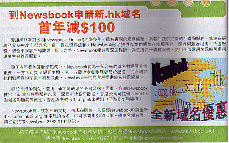 Newsbook为回馈客户的支持,由现在开始,只要经Newsbook申请全新 .hk.com.hk.org.hk字尾的域名,即可享首年$100回馈。优惠名额有限,请从速致电Newsbook 2782-0197登记。想了解更多关于Newsbook的服务详情,欢迎浏览Newsbook的网站:www.newsbook.net,或致电Newsbook 2782-0197/电邮至 info@newsbook.net查询。