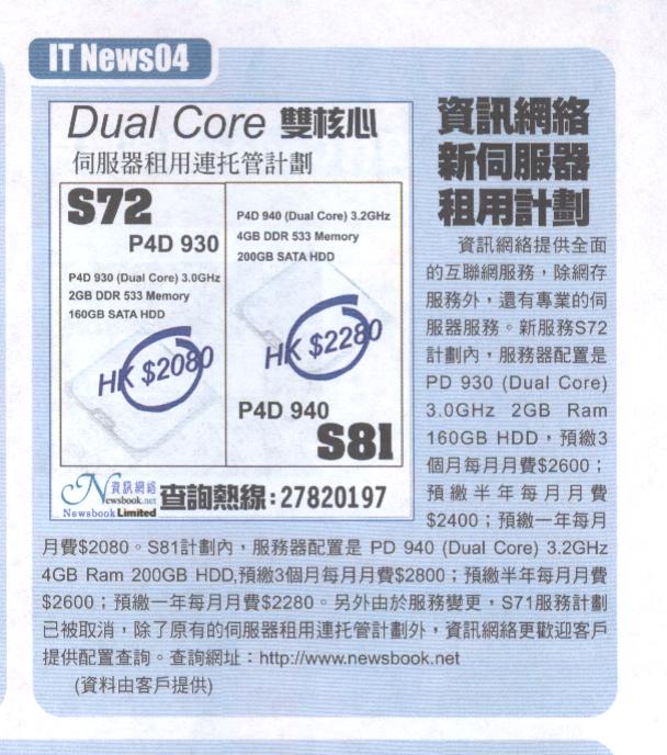 S72 new service plan, the server configuration is P4D 930 (Dual Core) 3.0GHz 2G Ram 160GB HDD, prepaid monthly fee for 3 months is HK $ 2600; prepaid monthly fee for half a year is HK $ 2400; prepaid a year fee is HK $ 2080. S81 program, server configuration is P4D 940 (Dual Core) 3.2GHz 4G Ram 200GB HDD, prepaid monthly fee for 3 months is HK $ 2800; prepaid monthly fee for half a year is HK $ 2600; prepaid monthly fee for a year is HK $ 2280. In addition, as a result of service changes, S71 service programs have been canceled. Besides the original server hosting even hire scheme, newsbook also welcome customers asking about the price of configuration.